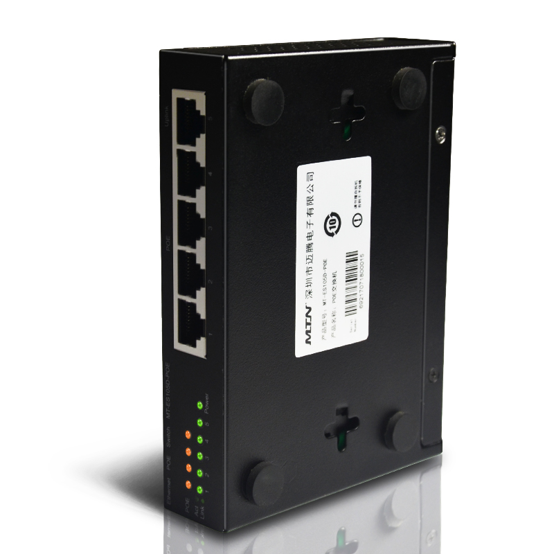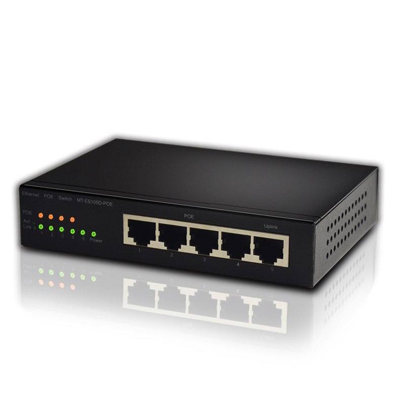 The MT-ES105D-POE Desktop Switch is a newly designed 5-port managed POE switch that provides an independent uplink port with 1 to 4 ports supporting the IEEE802.3AF / AT standard for monitoring engineering and network engineering, Can be wireless AP, IP cameras and other equipment power supply, plug and play, providing a low cost and high performance network solutions.